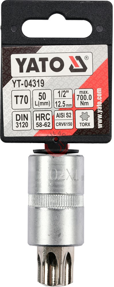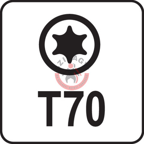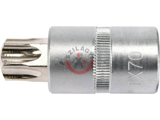 Professzionális TORX bithegy 1/2" meghajtású, T70-es kihajtással, krómozott CrV6150 acél, AISI S2 acélból készült és nikkel bevonatú.